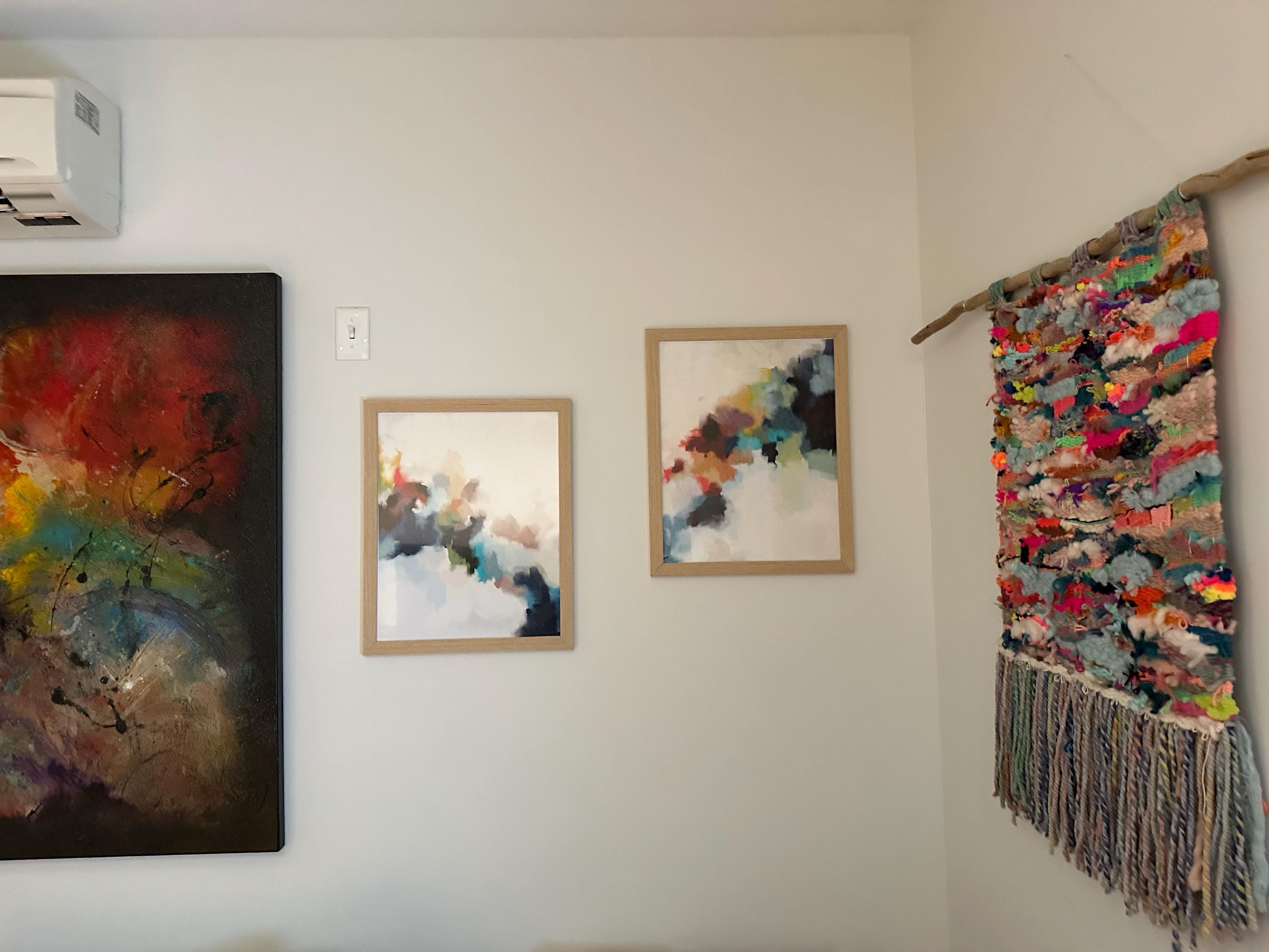 Abstract print set featuring shades of indigo blue, sage greens, wam reds and yellows. Modern home decor made from my original new media watercolor art. Enjoy this large colorful wall art in your home
