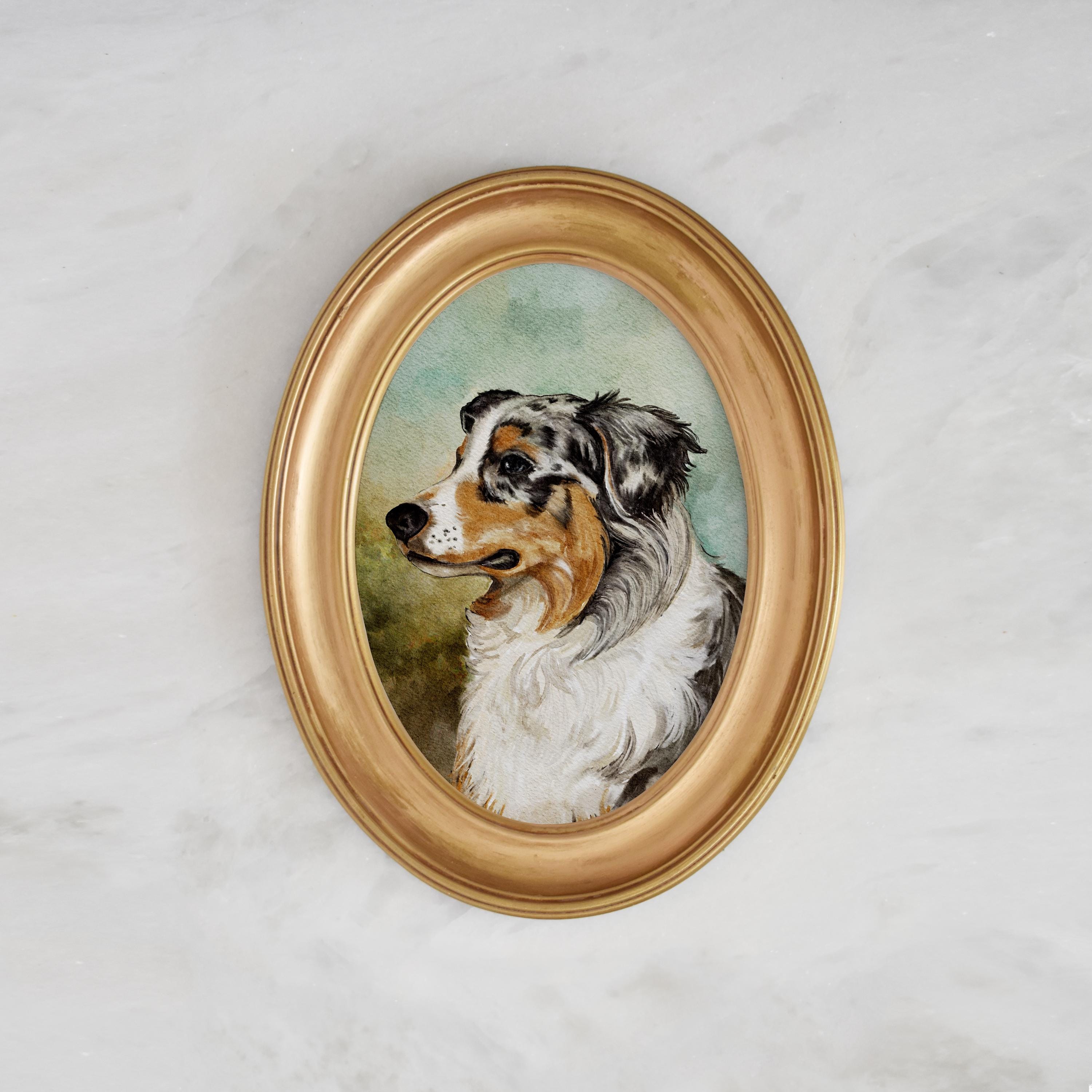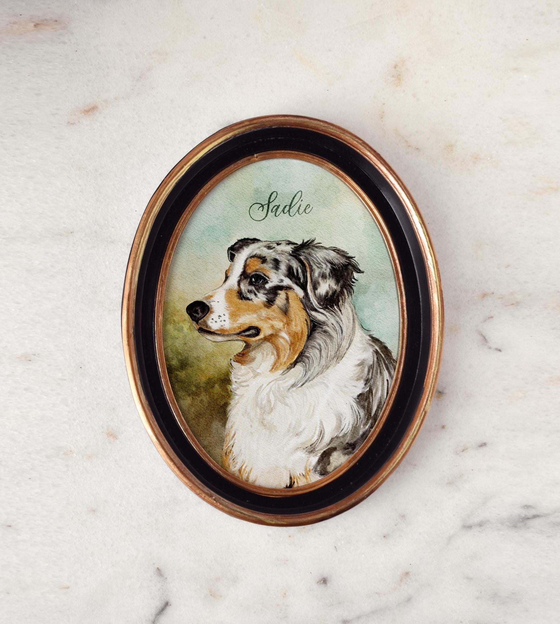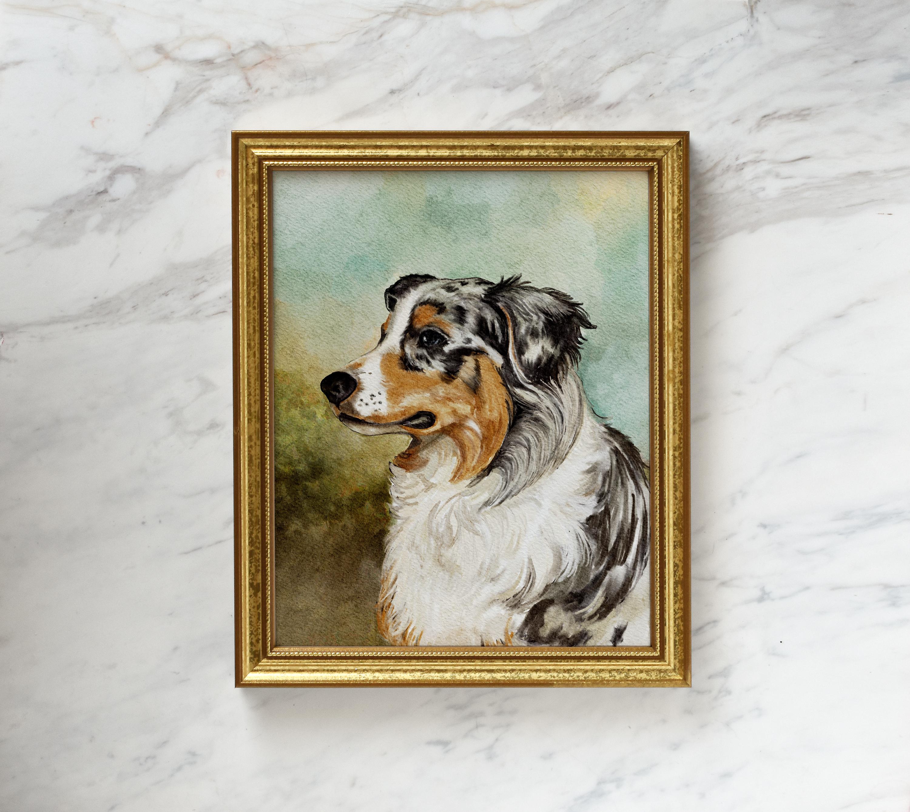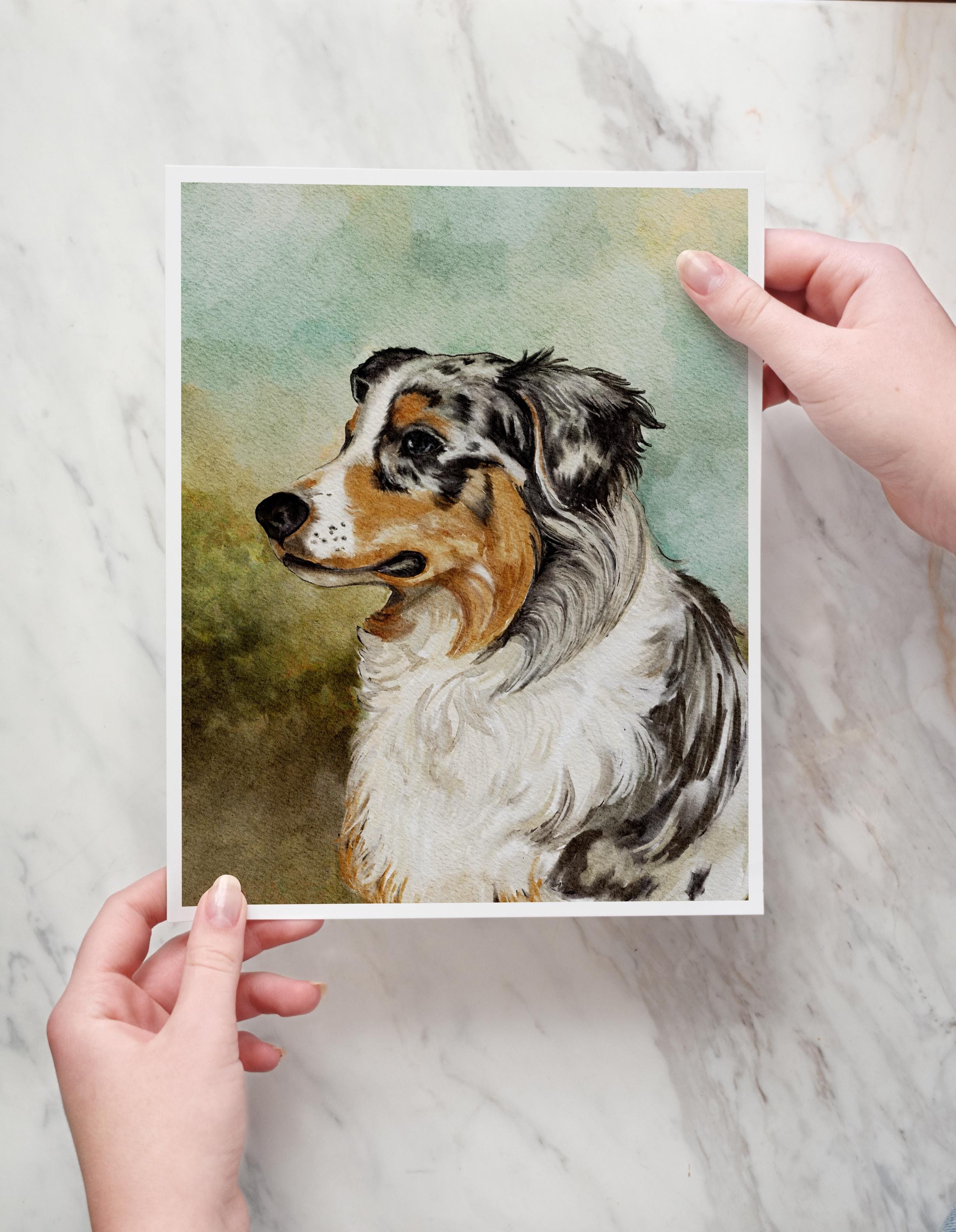 This Australian shepherd art print can be personalized with your dog’s name to make a sweet pet memorial gift or a fun gift for any dog lover, dog mom or dog dad. This watercolor style print is hand rendered with apple pencil (no ai) in a manner very like traditional painting. Once purchased I will personalize this print with your pets name and print on smooth cardstock. All of my prints are printed to order with archival inks. This pet painting will be cherished for years to come.